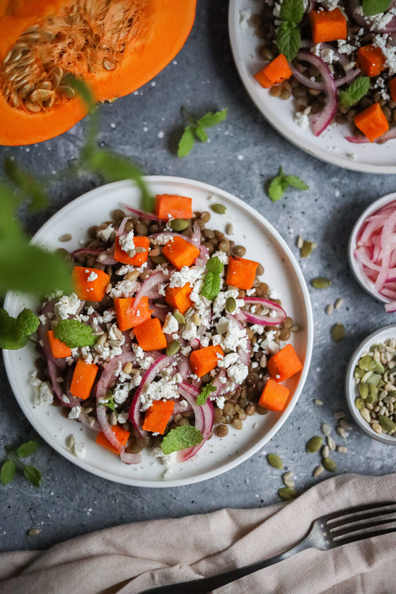 - Sałatka z pieczoną dynią, soczewicą, fetą i piklowaną cebulką