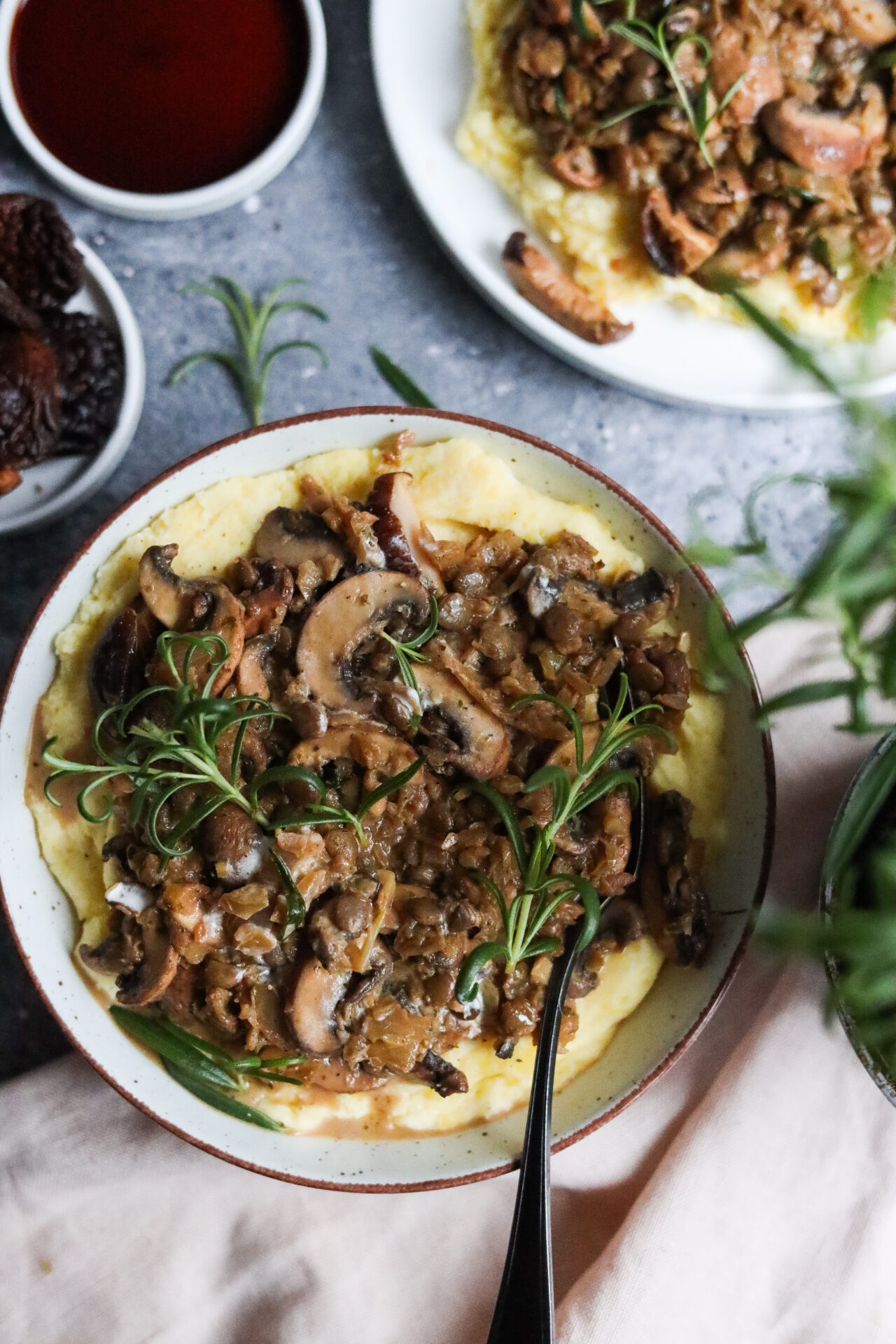 - Gulasz grzybowy z soczewicą na puree ziemniaczanym